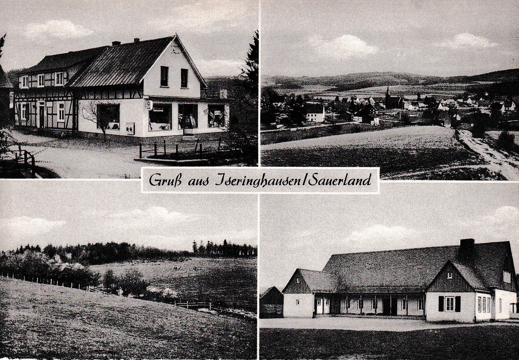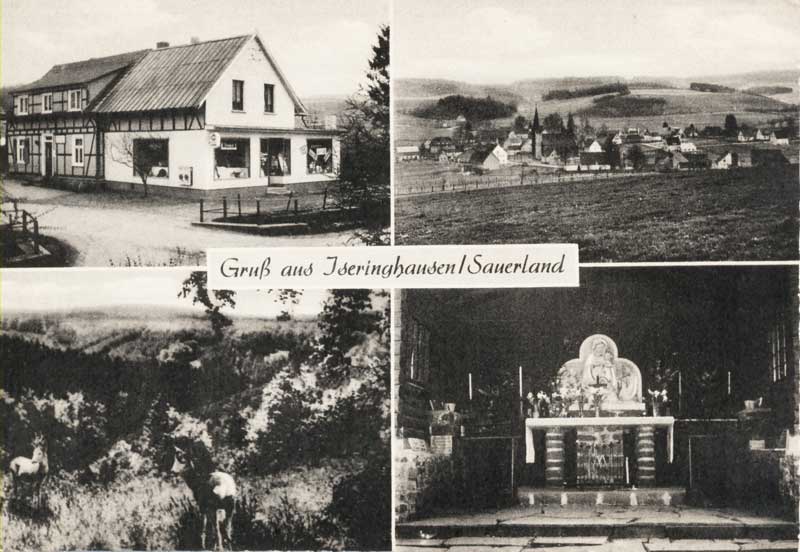 Jetzt wird es so richtig spannend! Wusstet ihr, dass es früher Einkaufsläden bei uns in Iseringhausen gab? Auf der ersten Postkarte ist links oben der alte Tante-Emma-Laden „Auf dem Wigger“ zu sehen. Betrieben wurde er von den Inhabern Paul & Elisabeth Lange bis in die frühen 90er. Das Gebäude ist mittlerweile zu einem Wohnhaus umgebaut worden. Auf derselben Karte findet man zudem die alte Grundschule. Die zweite und dritte Postkarte zeigen Ortsaufnahmen. Die vierte Karte ist ähnlich aufgebaut wie die erste, jedoch wurden hier noch die Waldkapelle „Hünkeshohl“, eine andere Aufnahme des Dorfes und ein Bild mit zwei Rehen ausgewählt.