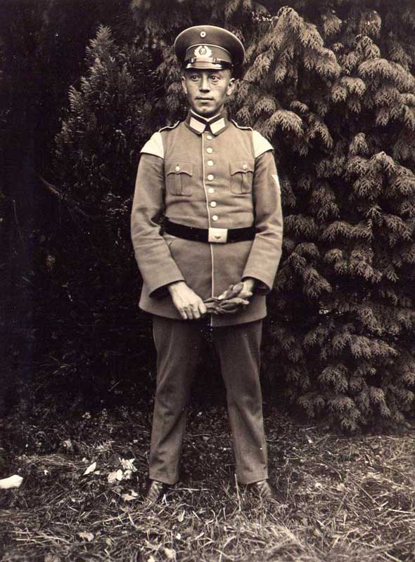 Dieses Foto zeigt einen deutlichen Unterschied zu den Uniformen, welche im Zweiten Weltkrieg getragen wurden. Erkennen lässt es sich an dem Stehkragen, der Schirmmütze und dem Gürtel. Außerdem trägt der Offizier hier keine Stiefel, sondern eher eine Art Anzugsschuhe.