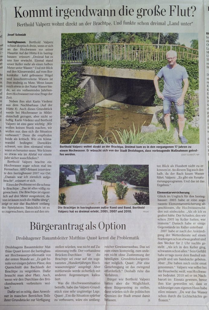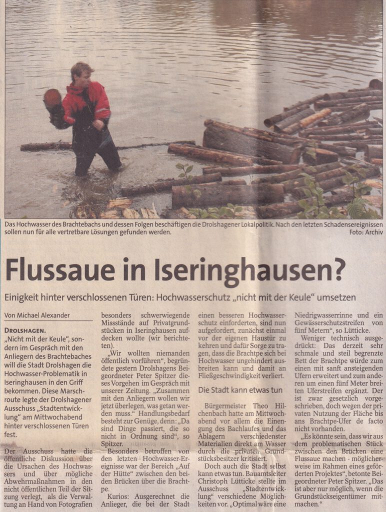 In diesem Artikel berichtet die Westfalenpost von dem Drolshagener Ausschuss „Stadtentwicklung“ bezüglich der Hochwasserereignisse in Iseringhausen.