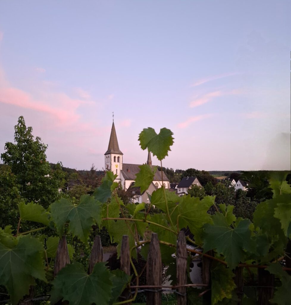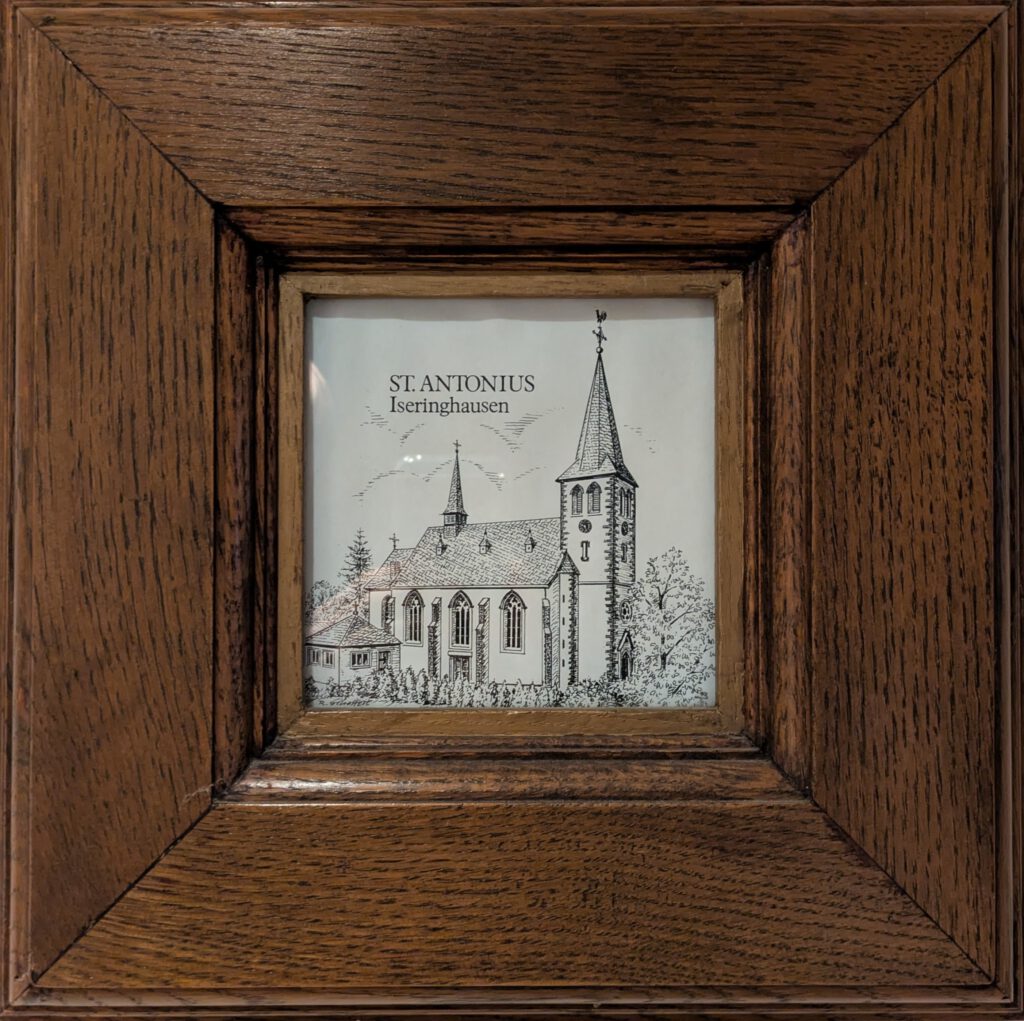 Dieses eingerahmte Foto zeigt unsere Kirche auf einer Küchenfliese. Laut Berichten gab es eine Person im Ort, welche Fliesen mit Motiven bemalt und verkauft hatte.