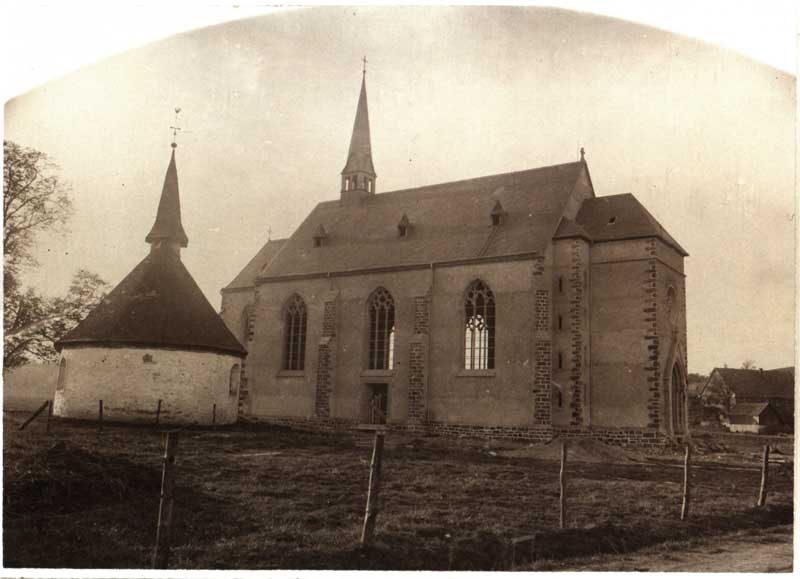 Sie hebt sich herab von allen anderen Bauten drumherum – Unsere Kirche. Hier fehlt immer noch der weiße Außenputz am Gestein und die Bäume sind erst wenige Jahre alt. Heute stehen von diesen so gut wie gar keine mehr.