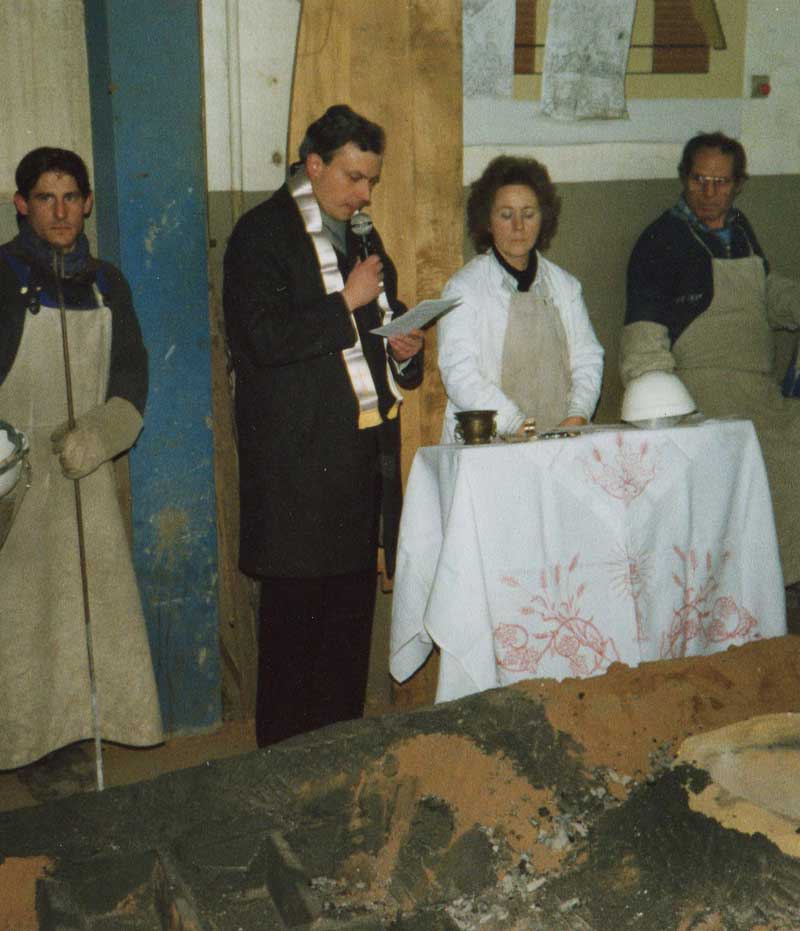 - 4) Die Gastarbeiter stehen vor der Kirche, welche bereits einen Teil des Daches besitzt
