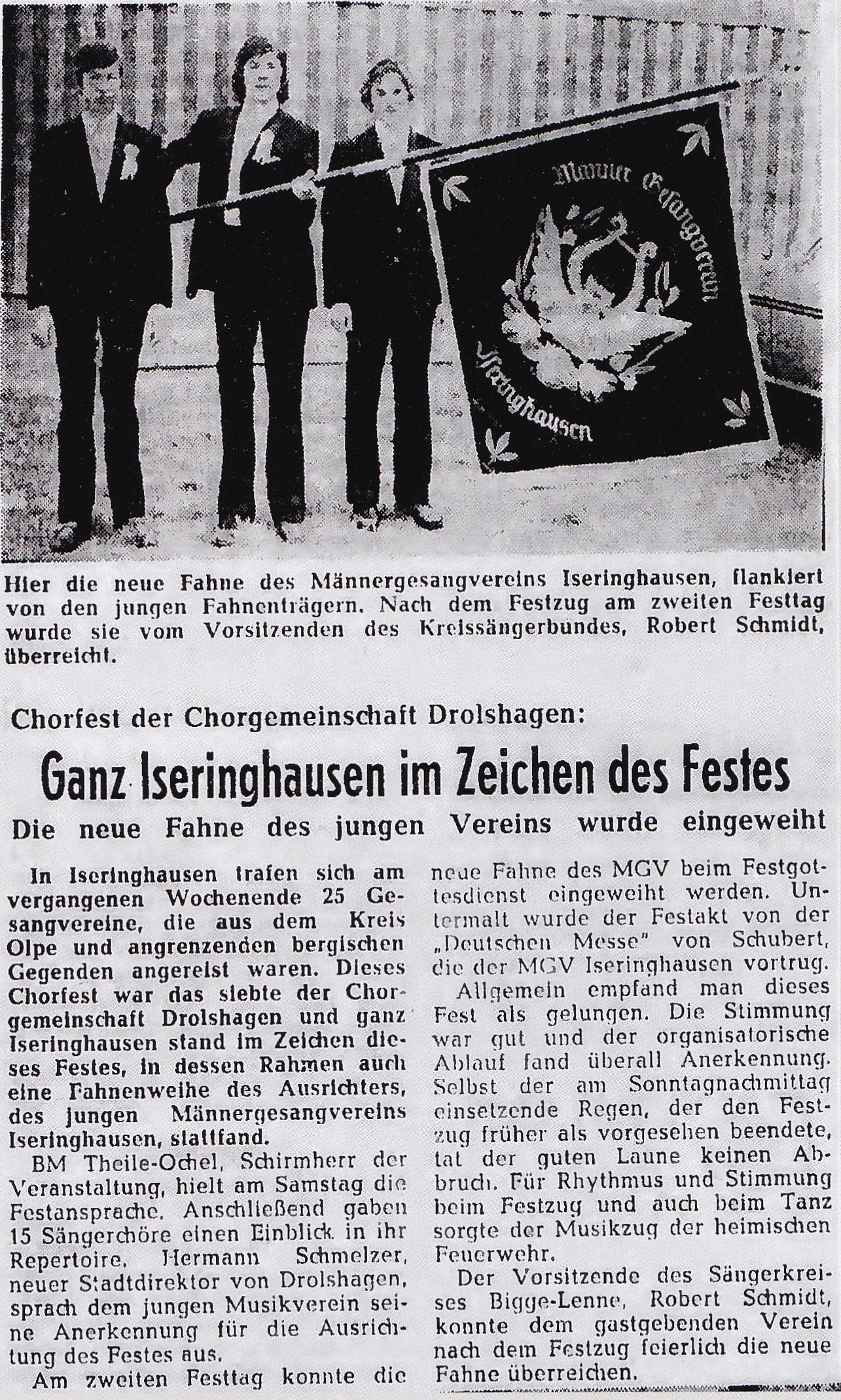 Das Gruppenfoto vor der St. Antonius Kirche ist auch für den MGV Iseringhausen von großer Bedeutung. Denn es entstand für ihr Sängerfest im Jahr 1973. Ganz besonders an diesem Fest war die eigene Vereinsfahne. Für 2.240,- DM wurde diese angeschafft – Umgerechnet sind das heute etwa 1.775,00€.