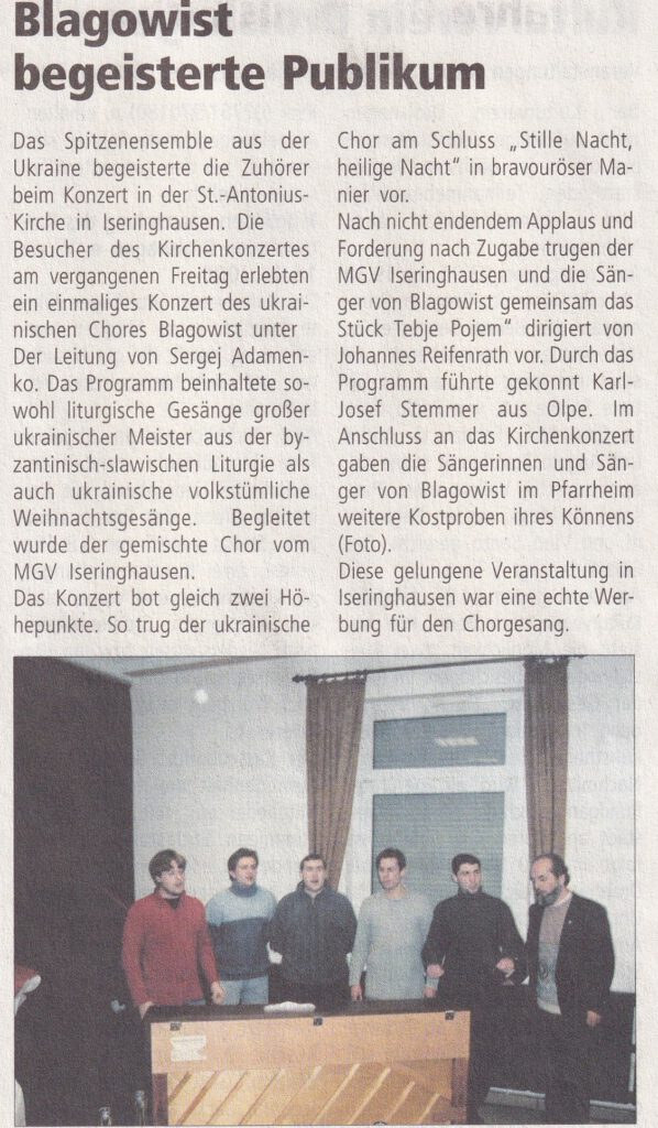 Es ist schon etwas Besonderes, wenn ein Chor extra aus der Ukraine anreist, um in Iseringhausen zu singen. Doch die Sänger des Spitzenensembles „Blagowist“ verwirklichten dies im Jahr 2006. Sie sangen viele bekannte Stücke aus ihrer Heimat und bekamen dafür großen Applaus von den Gästen.
