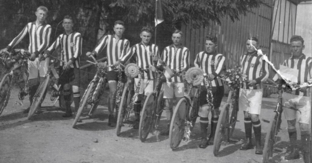 Lange bevor es die Spielvereinigung gab, kickte der Fußballclub Iseringhausen auf dem Sportplatz. Auf dem Foto erkennt man die ersten Spieler nach dem zweiten Weltkrieg und im Hintergrund ist das Dorf zu sehen.