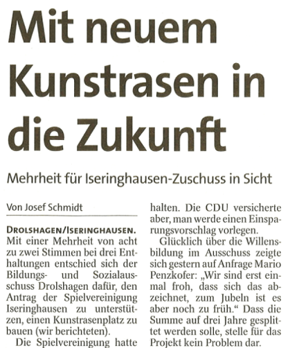 Damit die Pille wieder gekickt werden konnte, musste ein Kunstrasenplatz her. Mit Fördergeldern und Spenden wurde der Sportplatz schließlich mit grünem Rasen und Granulat ausgestattet. Fortan spielt die SpVg Iseringhausen auf Ihrem modernen Spielfeld und zieht weiterhin die Zuschauer & Fans wie ein Magnet an.