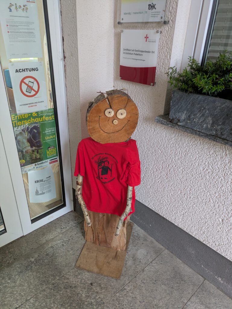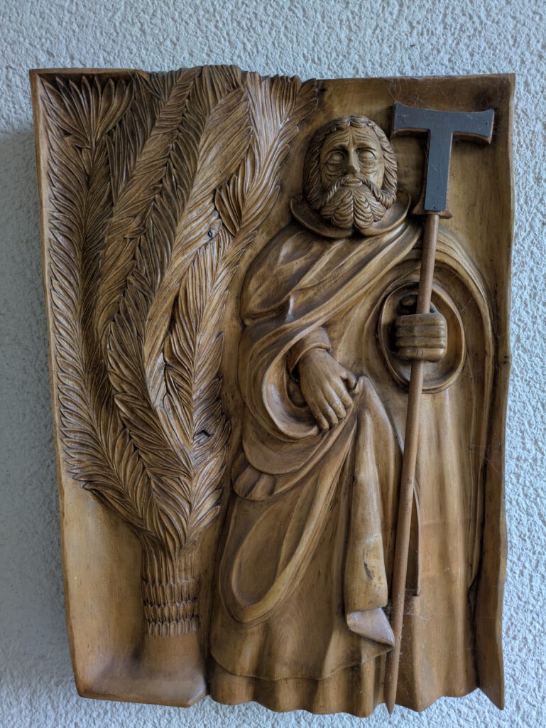 Wer den Kindergarten selbst besucht oder sein Kind dorthin gebracht hatte, dem wird diese Holztafel am Eingang aufgefallen sein. Sie zeigt den heiligen Sankt Antonius. Der Kindergarten und unsere Kirche wurden nach ihm benannt, da er als Schutzpatron der Frauen und Kinder gilt.